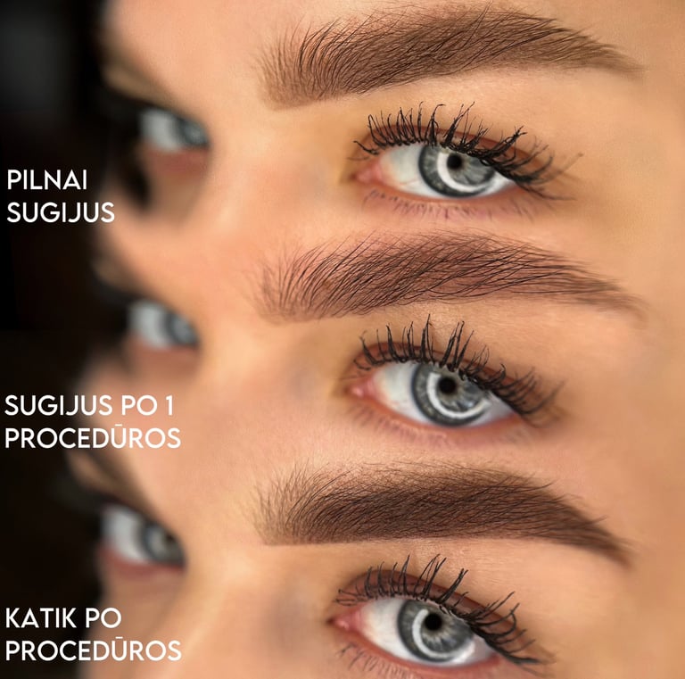 Po pirmo vizito sugiję anakiai gali atrodyti labai įvairiai - nuo labai švelnau rezultato iki praktiškai baigto darbo. Todėl stengiamės pirmo vizito metu atlikti švelniau, tuomet matome kiek spalvos liko, kaip oda priime pigmentą ir kiek jo dar įdėti tobulam rezultatui. Procedūra pilnai baigta yra tik po korekcijos. Nuotraukose matote sugijusius rezultatus po pirmos procedūros.