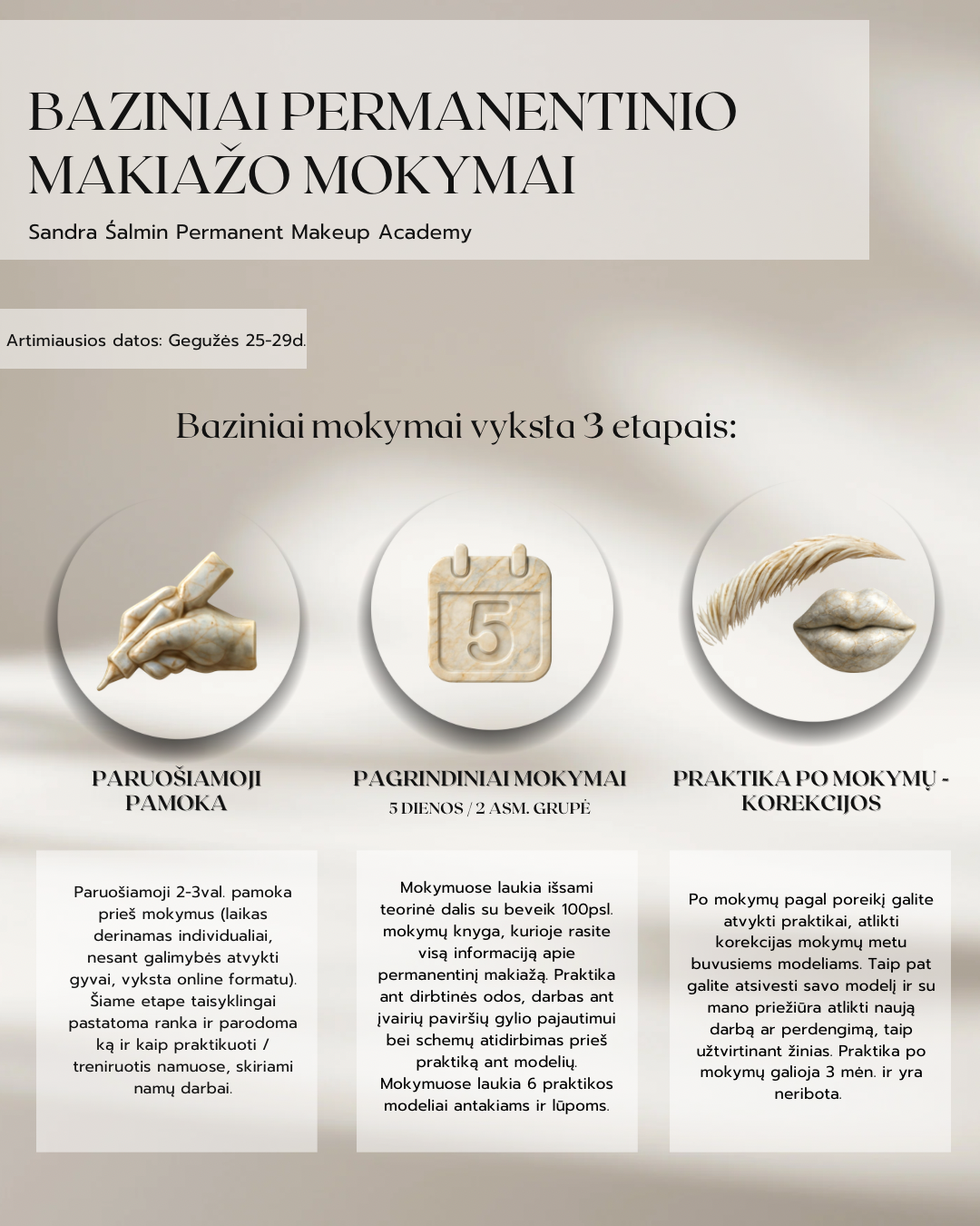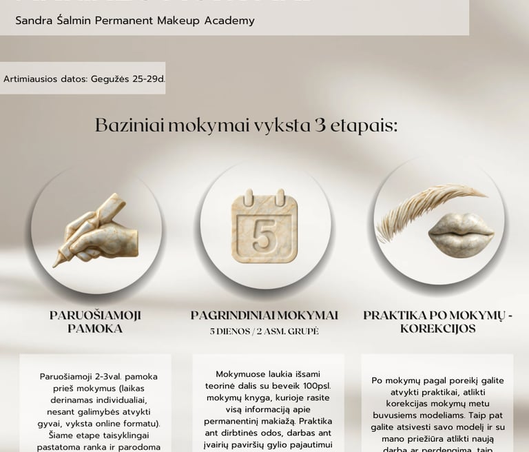 Tai profesionalus bazinis permanentinio makiažo kursas, skirtas toms, kurios nori pradėti karjerą atsakingai, sistemiškai ir aukščiausiu kokybės standartu. Šie permanentinio makiažo mokymai orientuoti ne į paviršutinį technikos atkartojimą, o į gilų metodo supratimą: odos analizę, pigmentologiją, aparato valdymą, gylio kontrolę ir estetikos suvokimą.